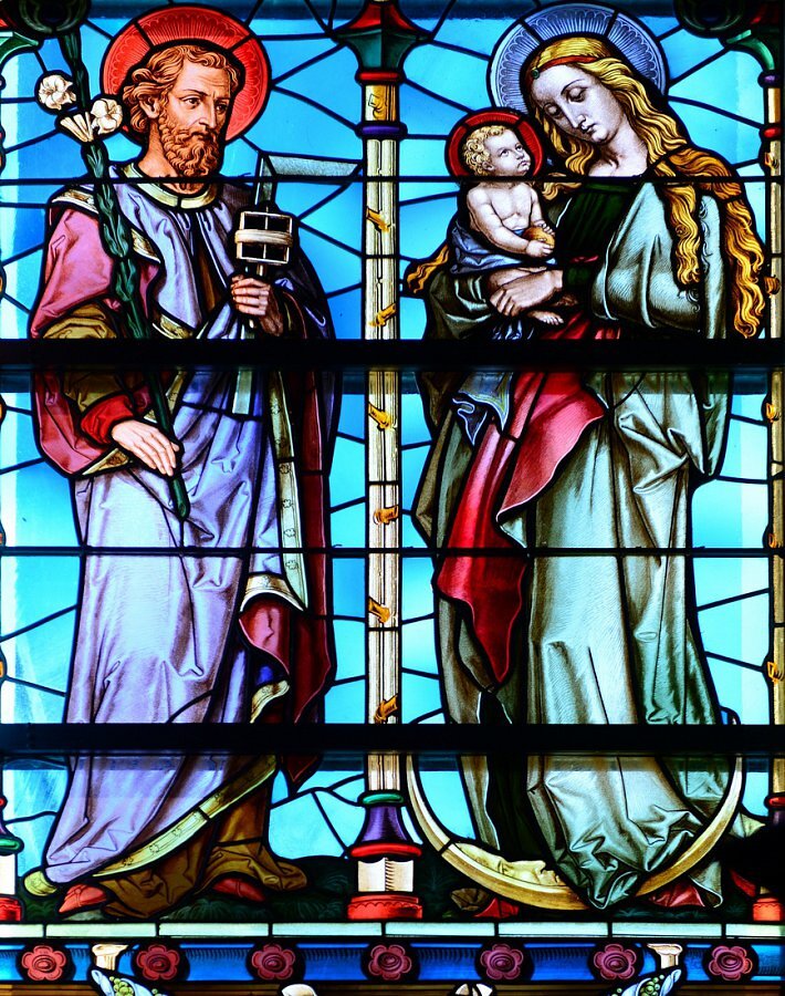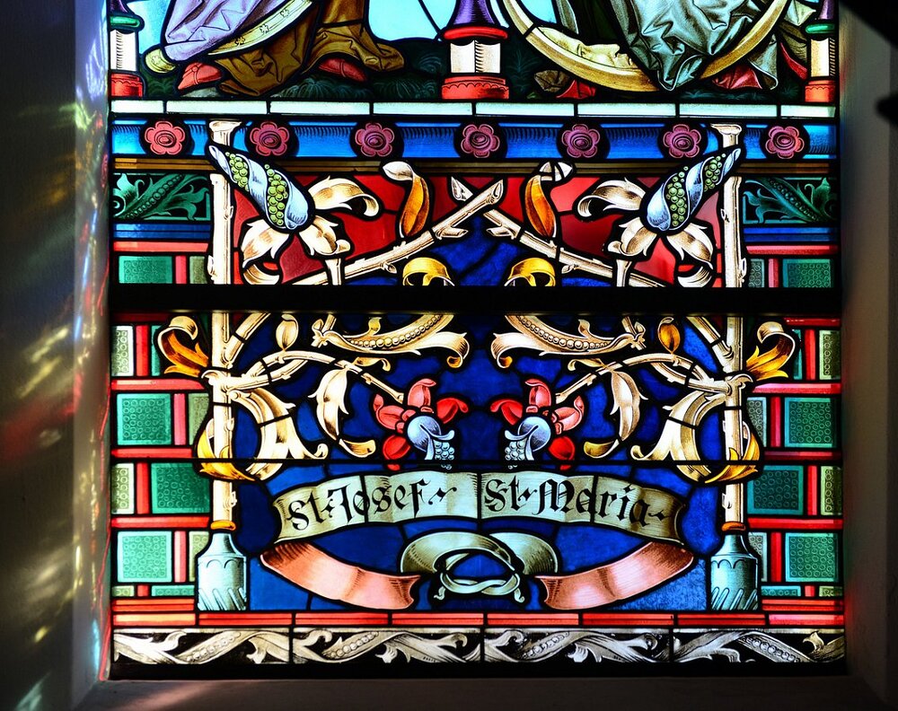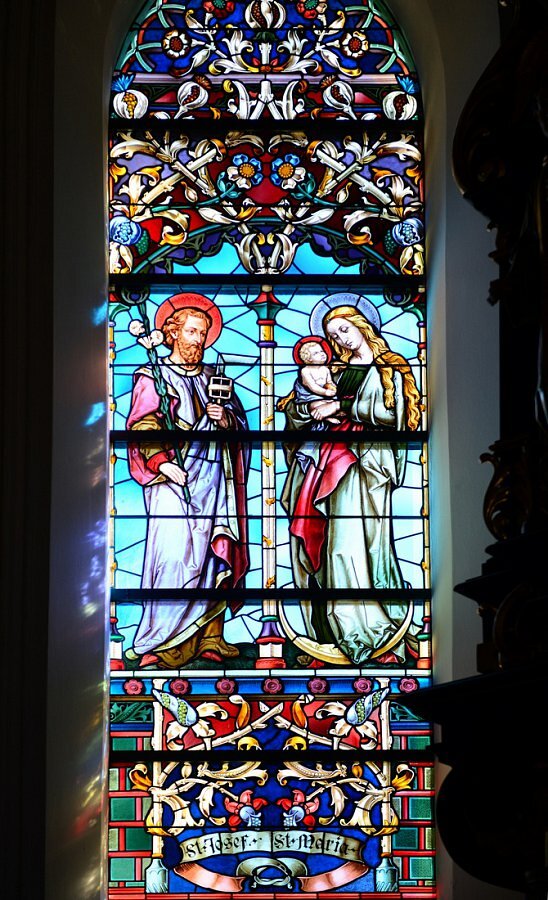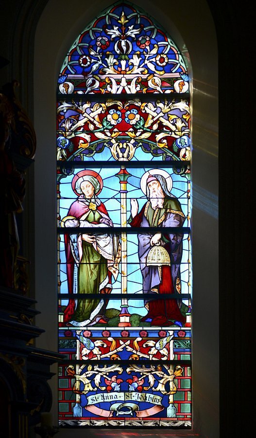 Glasgemälde Tiroler Glasmalerei Anstalt 1886, Chor hll. Joachim und Anna und Jesus im Tempel; Josef und Maria