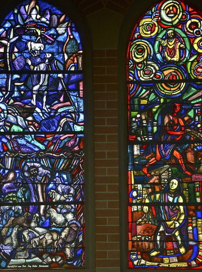 Glasmalerei im Chor, Tiroler Glasmalereianstalt, Innsbruck 1907, von links nach rechts : Evangelisten, Christus und die Emmausjünger, Anbetung des Kindes, Hl. Dreifaltigkeit, Christus mit Kindern, Christus erscheint Margaretha Maria Alacoque,