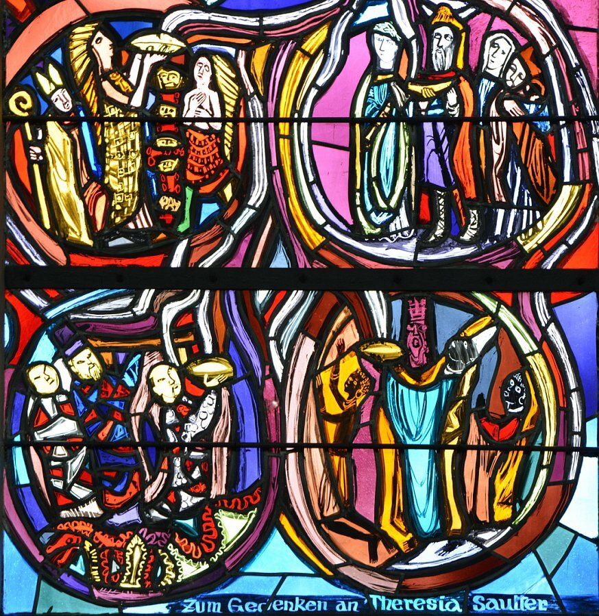 links: 1. Adam und Eva, Vertreibung aus dem Paradies, Fluch über die Schlange, Versuchung Jesu, Christi Tod und Auferstehung; 2. Kain erschlägt Abel; 3. Opfer Noahs nach der Sintflut; 4. Abrahams Berufung, Auszug nach Kanaan, Sohnverheißung, drei Gäste, 5. Opfer Melchisedechs; 6. Opfer Abrahams; 7. Isaak segnet Jakob; 8. Auszug aus Ägypten; 9. Mannawunder; 10. Aufblick zur ehernen Schlange; 11. Wurzel Jesse; 12. Leidensweg Jesu
