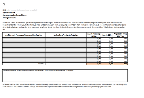 Vorlage Förderantrag Baukulturelles Erbe Land Vorarlberg Excel